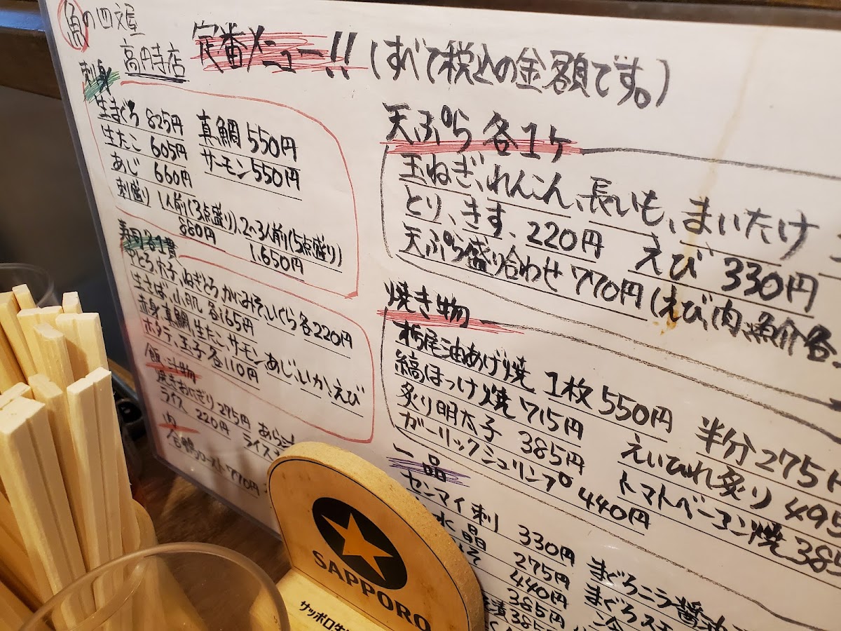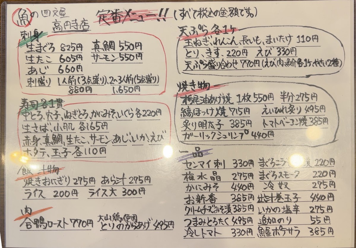 Sakana-No-Shimonya Kōenji’s menu is a celebration of fresh seafood and traditional Japanese flavors, masterfully prepared to highlight each ingredient’s natural taste. The 刺し身盛り合わせ stands out as a centerpiece, offering a vibrant array of seasonal fish, perfectly sliced and presented. For those seeking a smoky, savory experience, the イカの丸焼き delivers tender squid grilled to perfection, while the 銀だらかま照り焼き showcases rich, buttery black cod collar glazed with a delicate teriyaki sauce. Shellfish lovers will appreciate the briny sweetness of つぶ貝, and the subtly flavored 鮎の塩焼き provides a classic, lightly salted river fish experience. The menu also balances lighter options, such as バーニャカウダー and 揚ナス, alongside the indulgent 天ぷら盛り合わせ, creating a satisfying mix of textures. For sashimi enthusiasts, the 生サバ刺といわし刺 offers impeccably fresh mackerel and sardine, while simpler grilled items like イカ焼き highlight the quality of the ingredients without overpowering them. Small seafood delicacies, including 甘海老, are served with care, enhancing the menu’s focus on seasonal freshness. Accompanying drinks such as 黒ラベル 生 complement the flavors, making each bite more vibrant. Overall, Sakana-No-Shimonya Kōenji’s menu balances traditional Japanese preparations with a thoughtful presentation, ensuring that each dish, from the grilled specialties to the delicate sashimi, leaves a memorable impression.